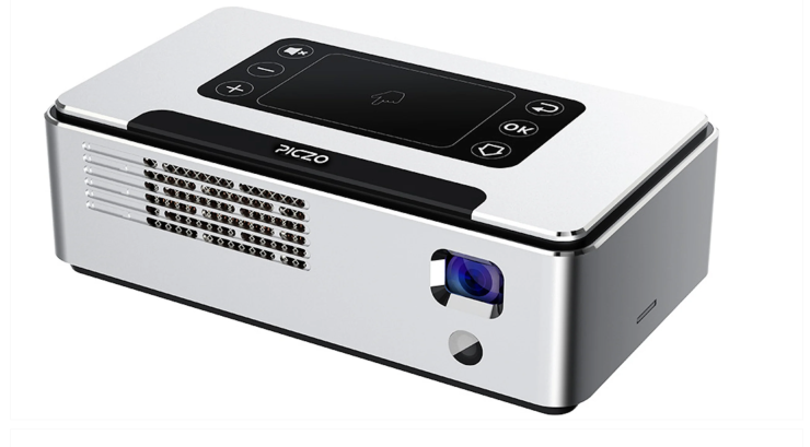 Jag köpte Piczo Nova Pro Touch när den lanserades och den har förutom inbyggda smart-funktioner och wifi även inbyggd högtalare och batteri. Den kopplas till vägguttag eller drivs av batteriet som räcker till cirka 2,5 timmar film. Batterimöjligheten bidrog till att jag slog till – trots att jag redan hade en annan projektor, vilket du kan läsa om längre ner...
