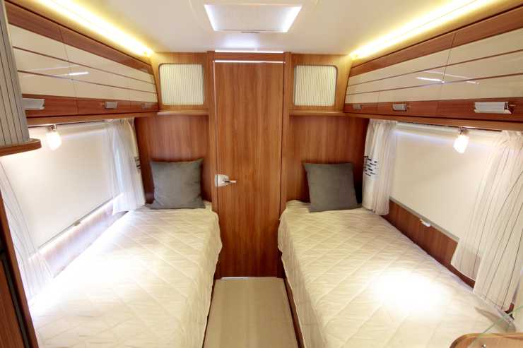 De två långbäddarna är olika stora och den ena mäter 195 x 75 centimeter medan den andra mäter 205 x 80 centimeter. Under de sköna kallskummadrasserna finns en ribbotten som ger god ventilation och huvudänden på sängen kan fås uppfällbar för god läskomfort, även om vår testbil inte hade det. Ovanför båda sängarna finns ”el-räls” som gör det möjligt att flytta läslampan till önskat läge. Överskåpen i sovdelen är placerade tillräckligt högt upp så att man inte ska slå i huvudet.
