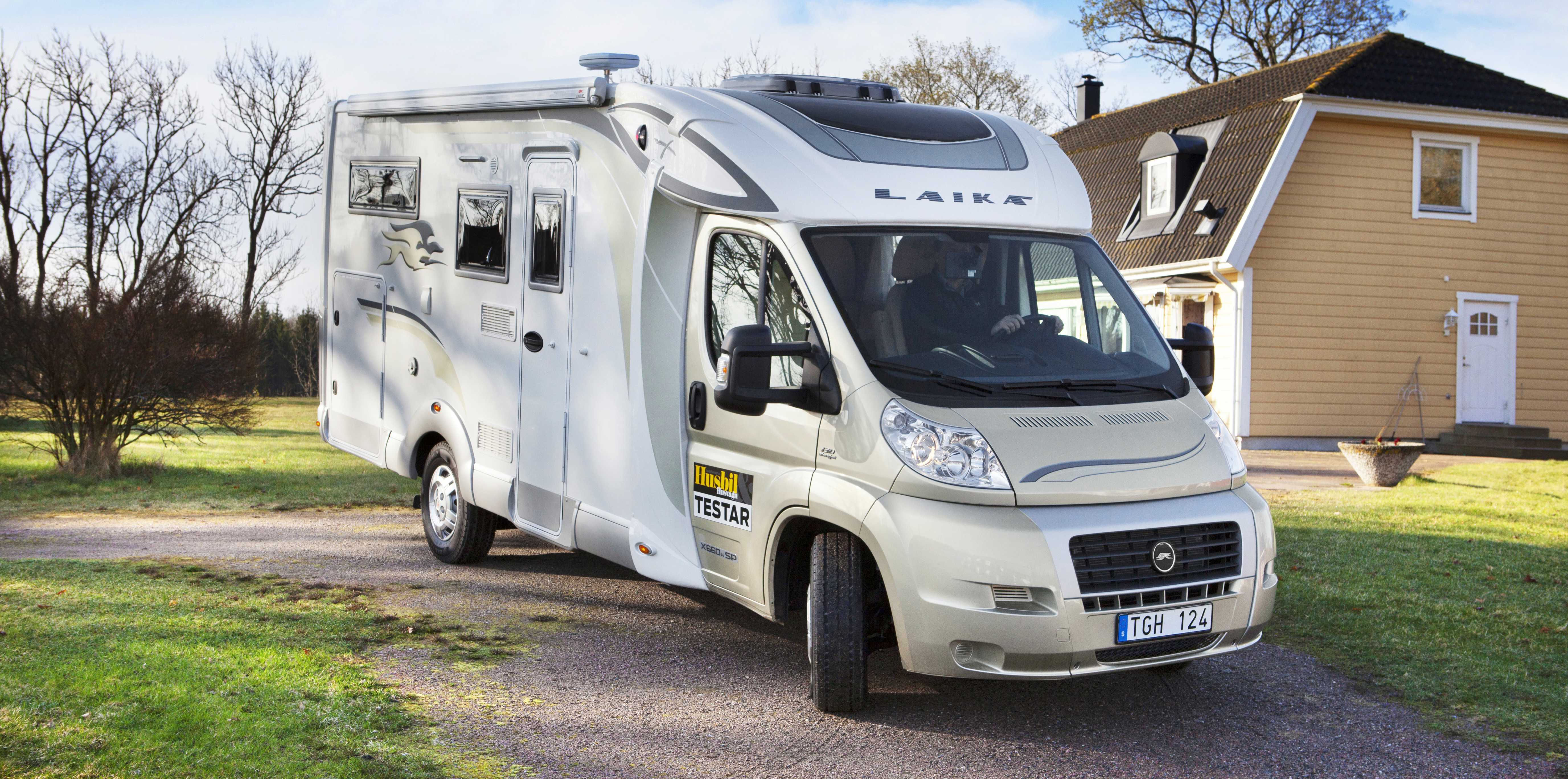 Hytten är lackad i champagnemetallic. Den nyansen, i kombination med silver, fortsätter bakåt över bodelens vita plåt i form av flammliknande slingor och Laika-loggor. Fönster finns på bilens alla sidor och i entrédörren. Tv-antenn, markis och larm ingår. Även bilens luckor är larmade.
