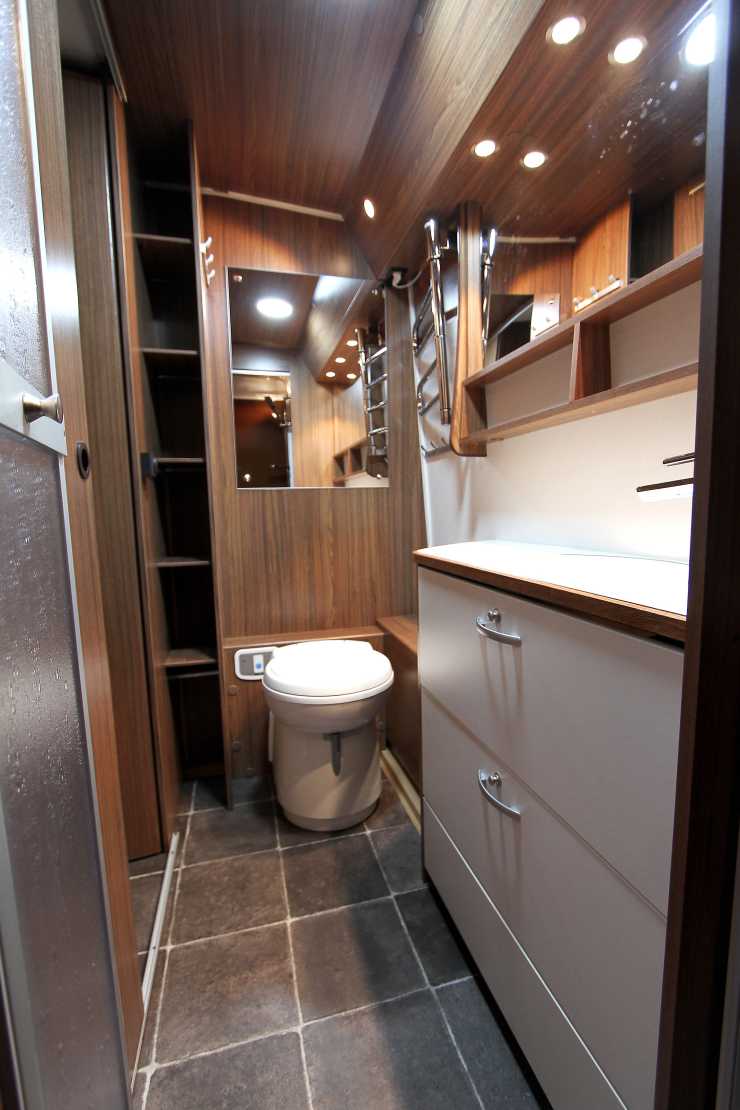 Modellbeteckningen PH betyder på Soliferspråk ”badrum”, det vill säga att här finns en stor toalett- och duschkombination längst bak som tar upp hela vagnens bredd. Förutom att det ger en väldigt trivsam badrumstillvaro med gott om svängrum är det också en fördel då risken att överlasta vagnens bakdel blir mindre. Många vagnar har lastutrymmen längst bak under sängarna vilket lätt kan ge en baktung vagn. Annars är toaletten rikligt utrustad med speglar, nästan så att vi blir lite blyga när vi ser oss själva överallt…