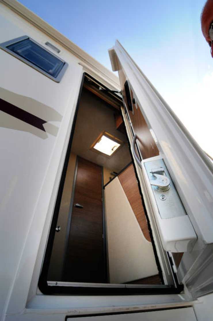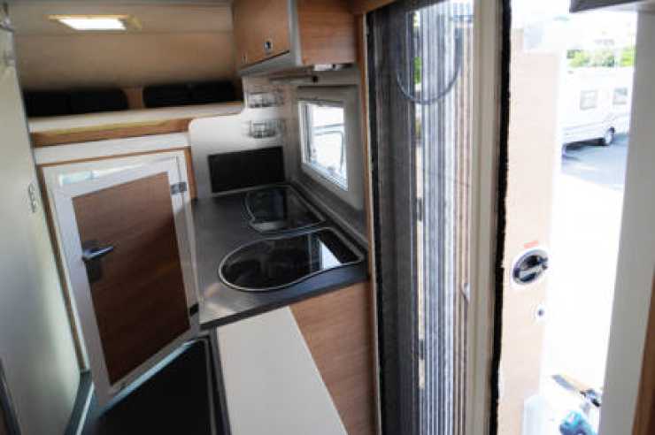 Mellan förarhytt och bodel finns en kryplucka. Köket är inte jättestort men har hyllor och glasluckor som ger bättre avlastning.