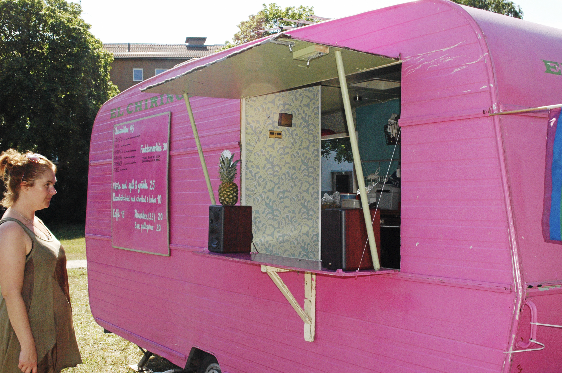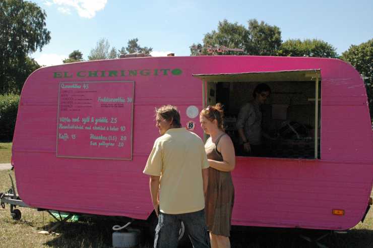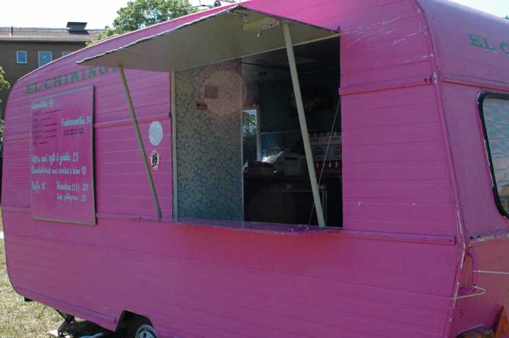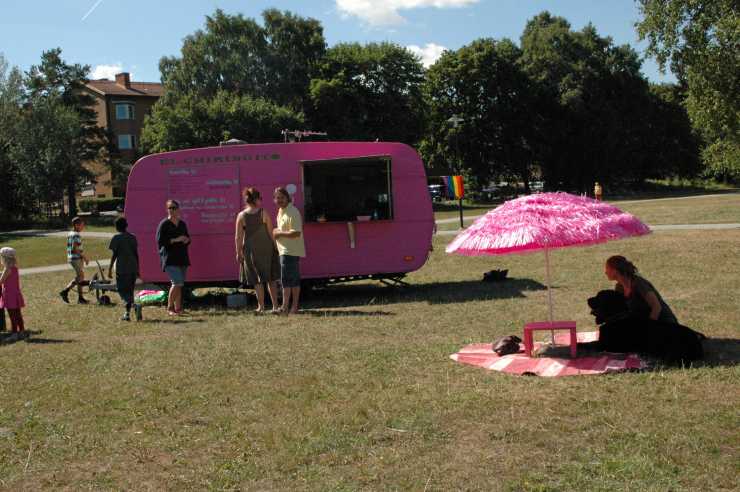 Den här rosa husvagnen har tjänstgjort som matvagn sedan 2008. Då bestämde sig Manuel Vidal och hans kompis för att öppna kafé i vagnen. Tidigare har den använts på olika festivaler. I år fick den ståplats på Nytorpsbadet söder om Stockholm.