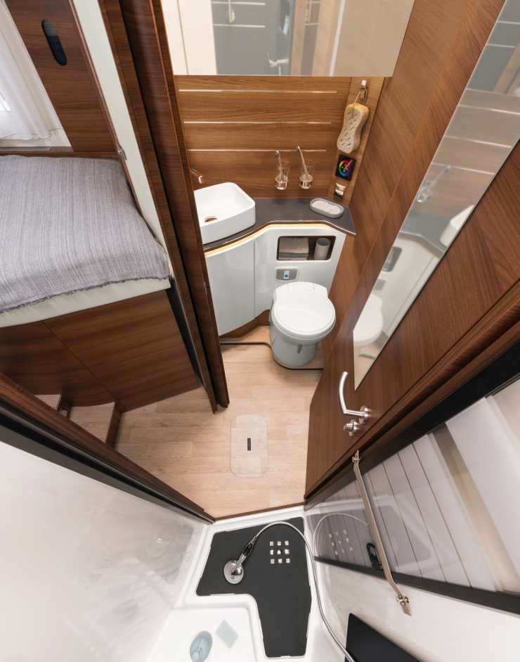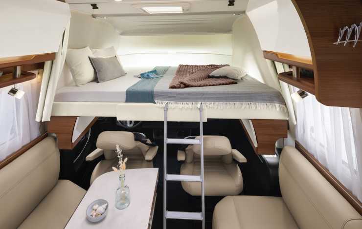Inredningen är klassiskt Rapido-snygg, med ljusa nyanser och en hel del i trä. Face to face-soffor och takbädd i den främre delen. Långbäddar och separat dusch och toalett, som kan skärmas av till ett lite större hygienutrymme, i den bakre delen. Sammanlagt finns fyra bältade platser och lika många sovplatser.