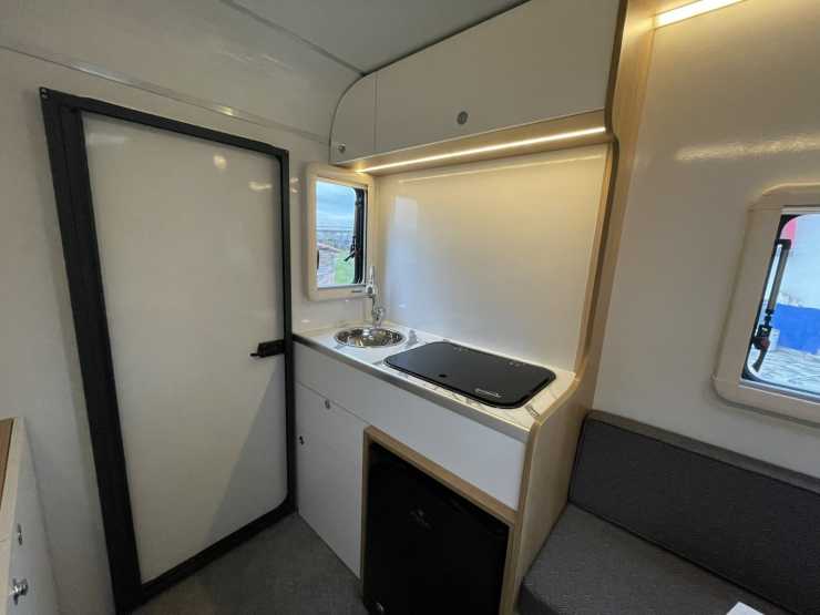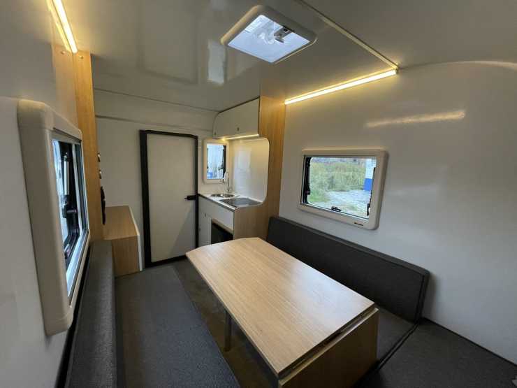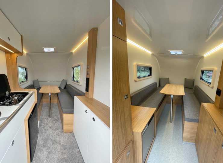 Båda modellerna fyller basbehovet i en husvagn, med bäddbar soffa och kök. I den större finns kök med tvålågig spis, kylskåp och diskho inne i vagnen, men i den mindre fälls det ut till ett utekök.