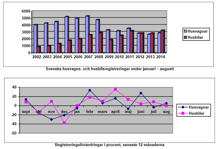 Augusti månads husbilsregistreringar visar 281 stycken, vilket är exakt lika många som under augusti föregående år. Hittills under kalenderåret 2014 har det totalt registrerats 3 239 husbilar, medan det under motvarande period 2013 registrerads 2 837 stycken. I procent innebär det en ökning med 14,17 procent för år 2014.