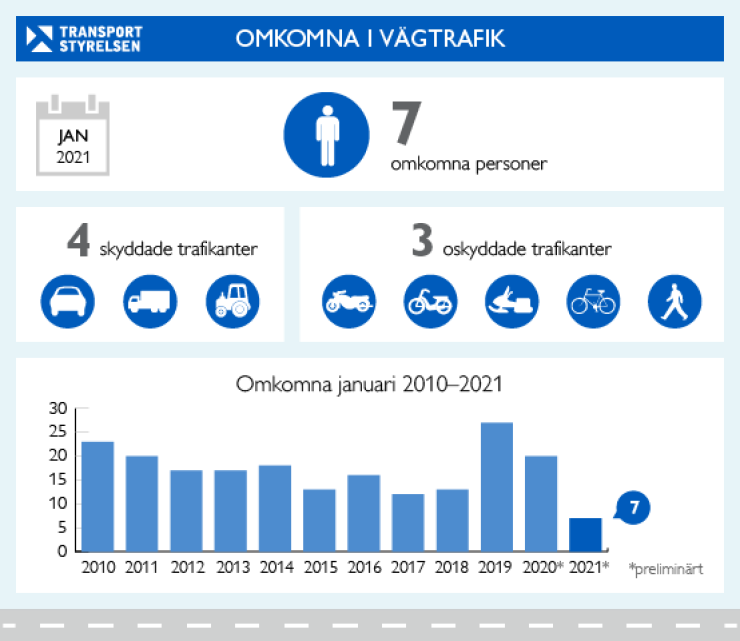 Under de senaste tolv månaderna (feb 2020–jan 2021) har 177 personer omkommit i vägtrafiken. Under de senaste föregående tolv månaderna (feb 2019–jan 2020) omkom 214 personer. Jämför man med ett femårs medelvärde för motsvarande tidigare tolv-månadersperioder har antalet omkomna minskat med 34 procent.