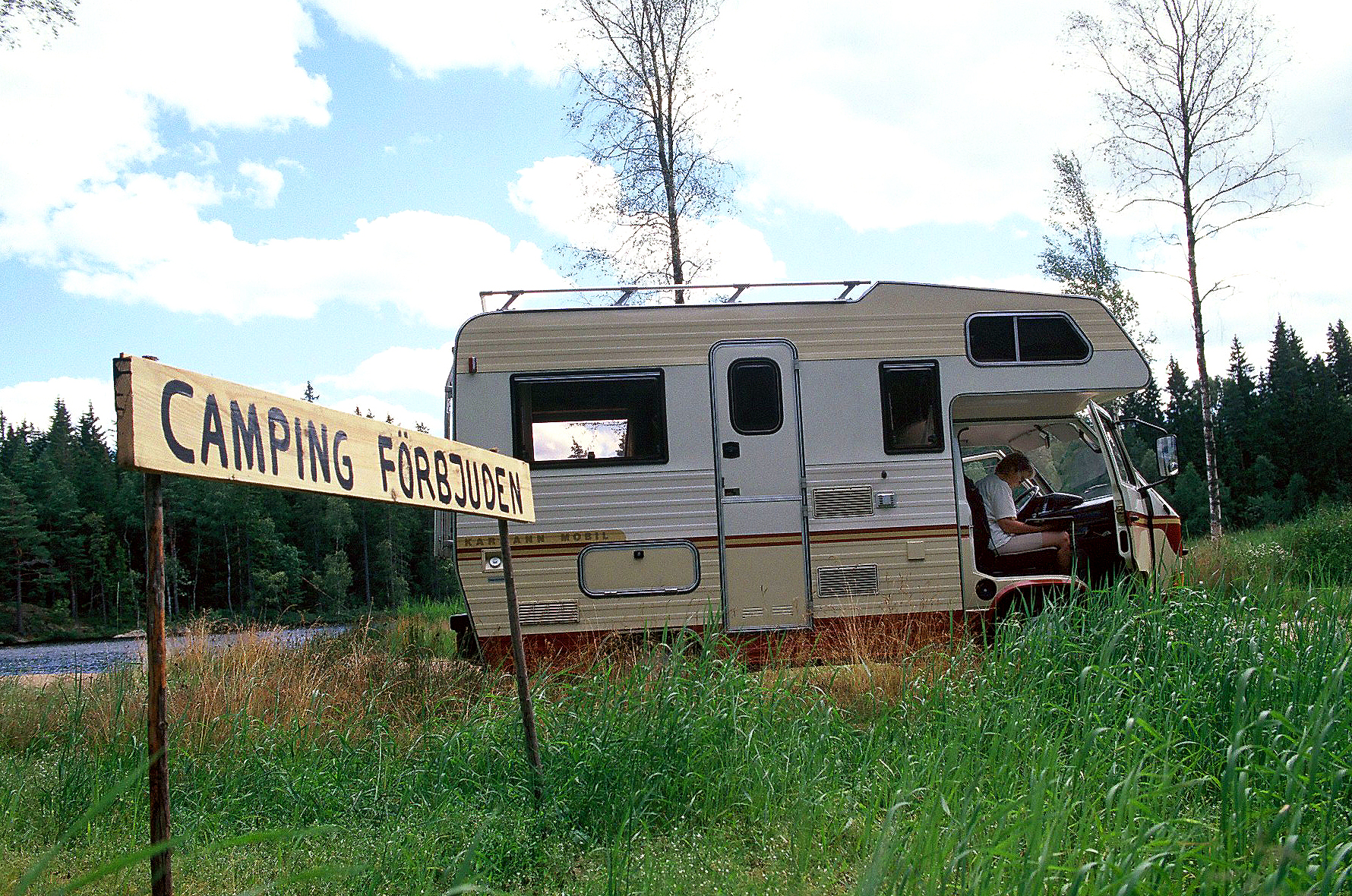 På vissa ställen har vi stött på egna skyltar om att camping är förbjuden. Det är väl sura markägare eller folk som bor i närheten som sätter upp skyltarna. Ingenting säger att det är förbjudet att stå där, och efter en dags körning kan det vara skönt att ställa sig på en plats där man trivs och kan sov gott.