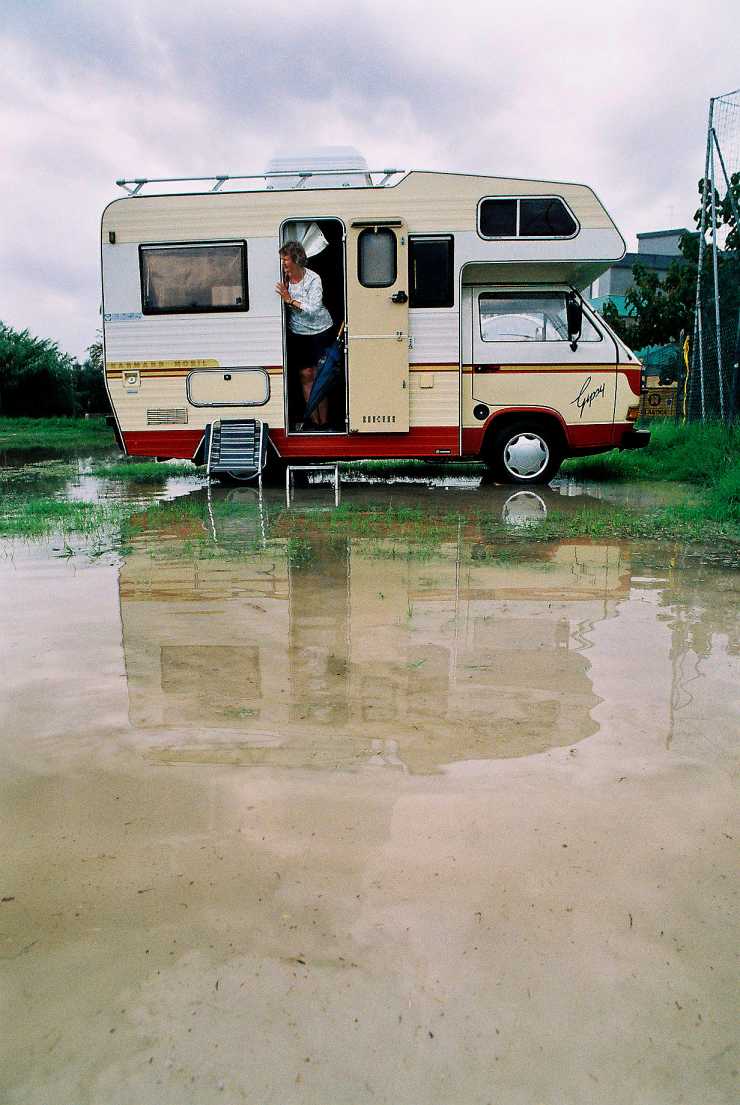 När vi vaknade på en ställplats i Fano, Italien, hade det regnat så mycke att hela ställplatsen var en stor vattenpöl. Som tur var så sjönk det in i marken relativt snabbt, men det var en överraskning att gå ut på morgonen och vi inte visste hur lång tid det skulle ta innan vi skulle kunna köra iväg igen.