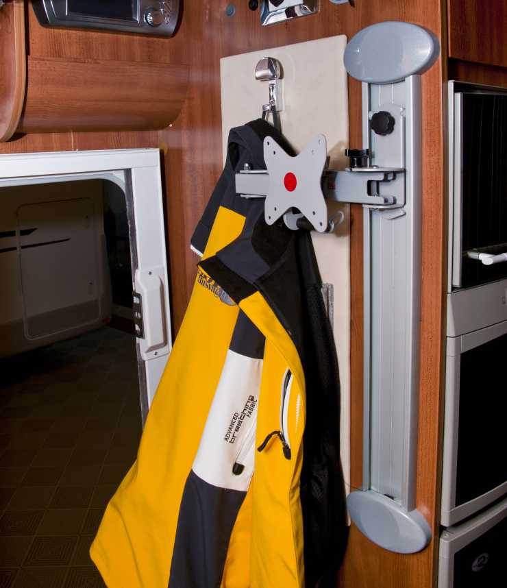 Vid huvudingången finns den av oss efterlängtade kroken där man kan hänga av sig ytterjackan och ett utfällbart fack. Tyvärr förstörs den förstas funktion av tv-fästet som med sin arm klämmer in jackan. Med en aldrig så liten platt-tv på fästet hamnar nöjesmaskinen också i vägen när fordonet ska äntras då man får akta sig för att inte slå huvudet i den.