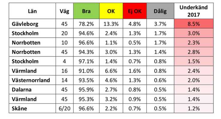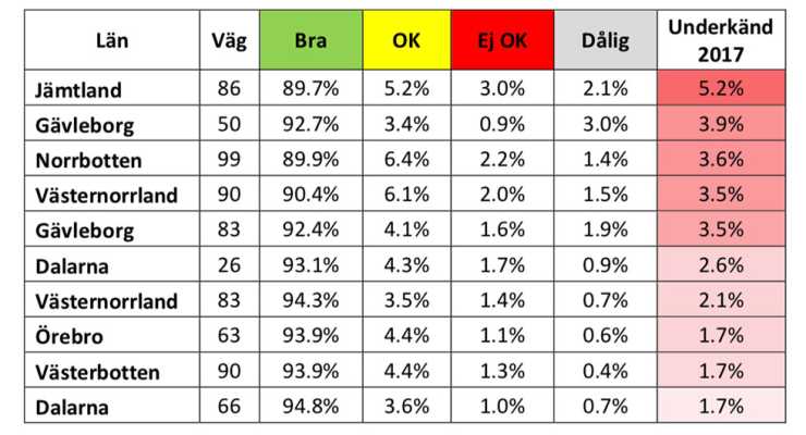 Du kan också se en interaktiv karta över vägskicket i Sverige här, eller läsa rapporten om vägkvalitet som pdf.