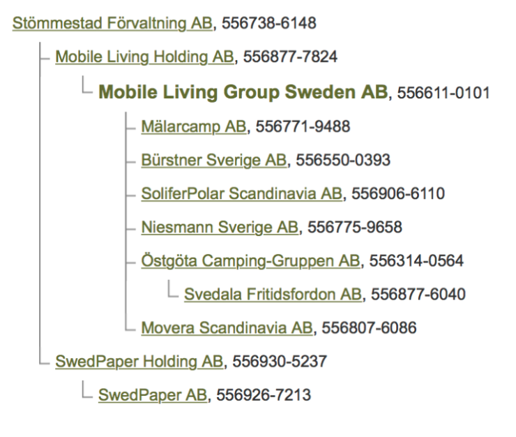 Mobile Living Holding AB är det bolag som har fungerat som koncernens ägarbolag. Bolaget saknar tillgångar men har en skuld på 22 miljoner kronor till Danske bank och en skuld till huvudägaren Stömmestad förvaltning AB. Det senare bolaget är inte försatt i konkurs.