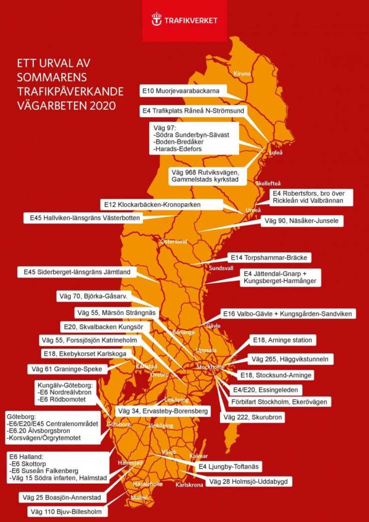 Hela listan på samtliga vägarbeten län för län finns på Trafikverkets hemsida.