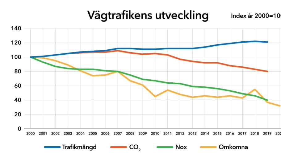 Vägtrafikens utveckling är nu mycket positiv. Alla centrala utmaningar som finns för att trafiken ska vara ledande i hållbar mobilitet och kunna fortsätta öka välfärden genom att alltfler får tillgång till körkort och bil utvecklas i rätt riktning. Antalet omkomna i trafiken var förra året rekordlågt och i takt med allt fler bilar med aktiva säkerhetssystem väntas nedgången fortsätta. Utsläppen av kväveoxider sjunker mycket snabbt. Koldioxidutsläppen minskar stadigt och den framgångsrika snabba elektrifieringen av bilismen som nu har inletts kommer att påskynda denna utveckling.
