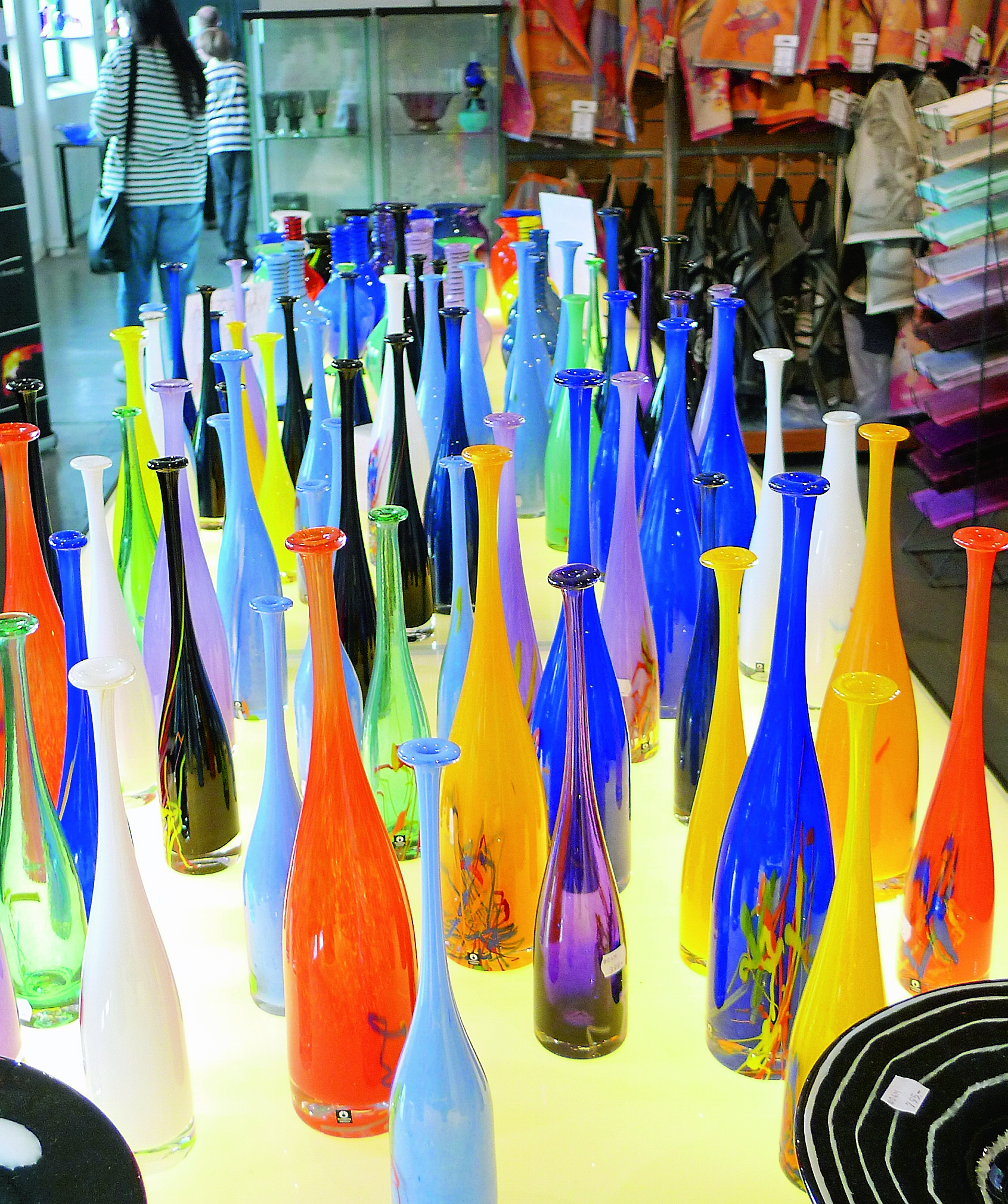 Gunne Brandstedt, som jobbat som glasblåsare i 50 år, har bland mycket annat en serie lysande färgsprakande vaser med smala halsar.