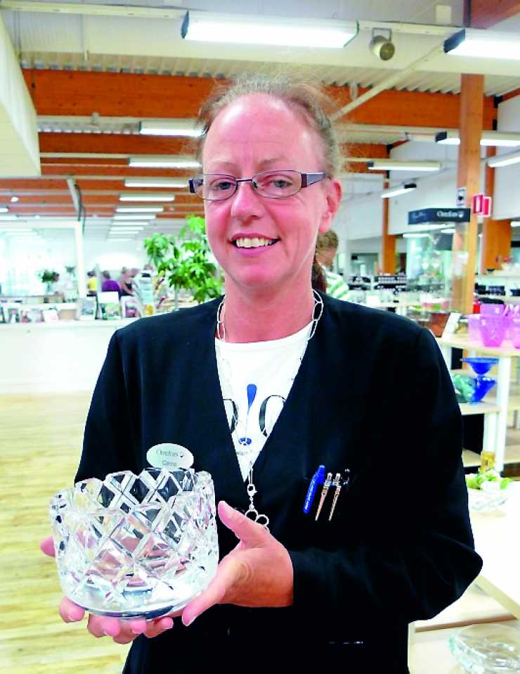 Men vi måste förstås förnya oss även när det gäller våra klassiska skålar och vaser, säger Carina och visar samma skål men med ett svart glasskikt ytterst. Detta kanske attraherar yngre kunder?