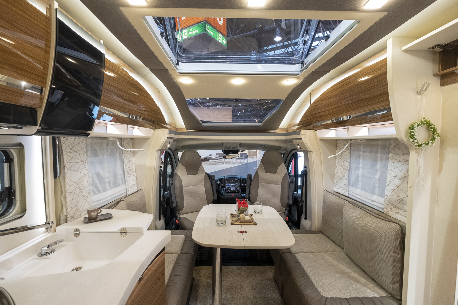 Det första vi lägger märke till i nya och halvintegrerade Eura Mobil Contura 760 EF är det läckra taket som tillverkaren själv kallar Starlight Dome. Här kan man skåda stjärnor från sittgruppen!