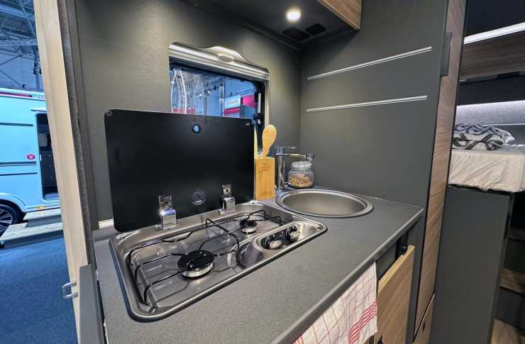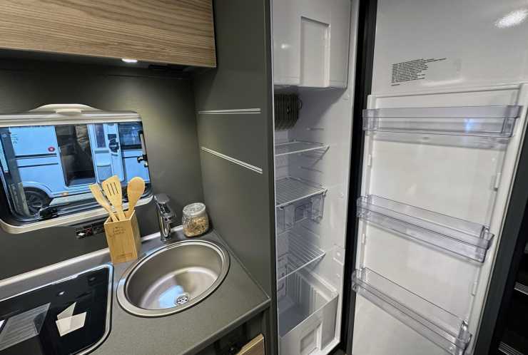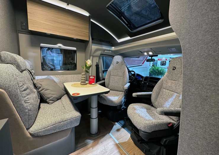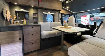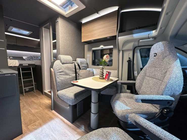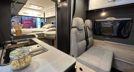 Husbilen vi tittar in i har den grå och mörkbruna färgsättning som varit populär de senaste åren. Grått kan ibland upplevas som lite sterilt, särskilt i kombination med vitt, men här blir intrycket precis tvärtom. Allt tack vare kombinationen grafitgrå väggar och mörkare trä i luckor och golv. Peppar och salt-mönstret på tygklädseln bidrar också till det mjuka intrycket. Att det inte finns några nivåskillnader mellan förardel och bodel är också ett plus.