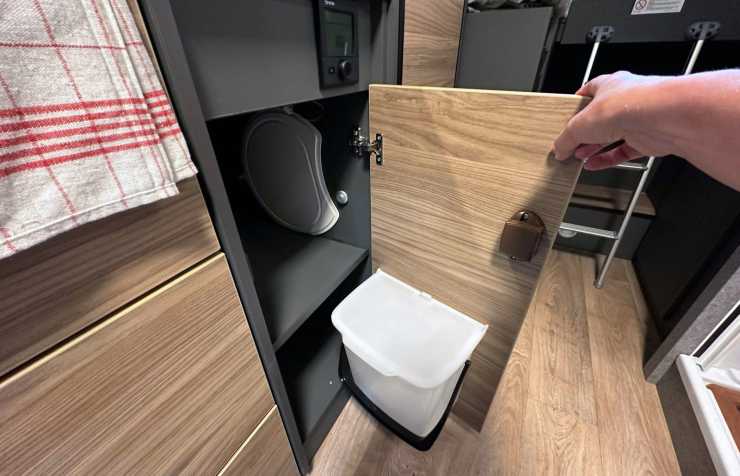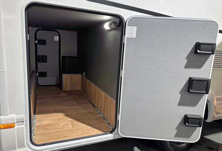 Längst bak finns det generösa bagaget med belysning, 230 V-uttag och totalt tre fästskenor. Handtaget till luckan har ett enhandsgrepp så att man slipper släppa det man har i händerna när den ska öppnas.