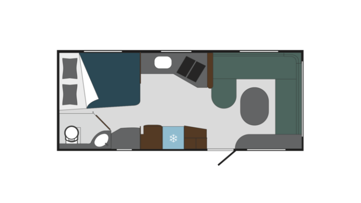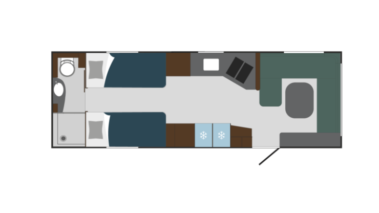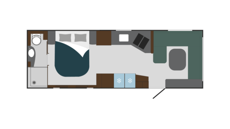 Önskas en riktig duschkabin bör någon av övriga 730-planlösningar väljas. 730 BQWL har en tvärstående queenbed med stort badrum längst bak som går från vägg till vägg. Samma typ av badrum finns i 730 BSL men denna modell har enkelbäddar framför.