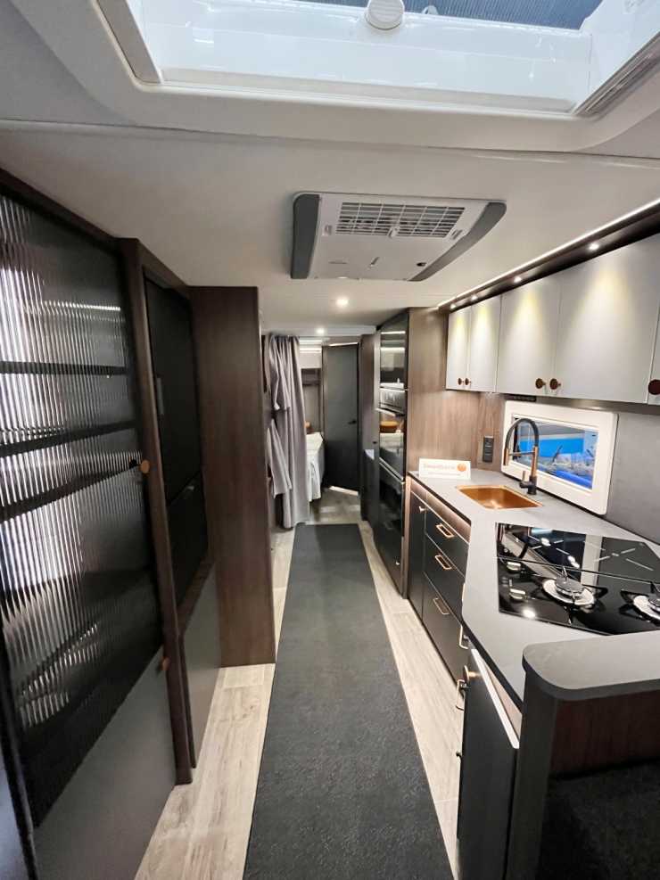 Längst fram i vagnarna finns den stora sittgruppen och på samma sida som entrédörren finns tv-uttag och ett sideboard. På motsatt sida från dörren sett finns köket med sina väl tilltagna ytor. Oavsett modell är köket hjärtat i vagnen. Två gasollågor samt induktionshäll med två plattor är standard.