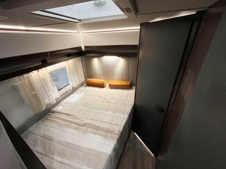 De två barnsängarna är placerade strax efter köket, vilket gör att den sidoplacerade dubbelsängen återfinns längst bak, bredvid badrummet. Eller förresten, bad och bad, här finns enbart toalett och ingen dusch, men däremot gott om förvaring till allas hygienartiklar.