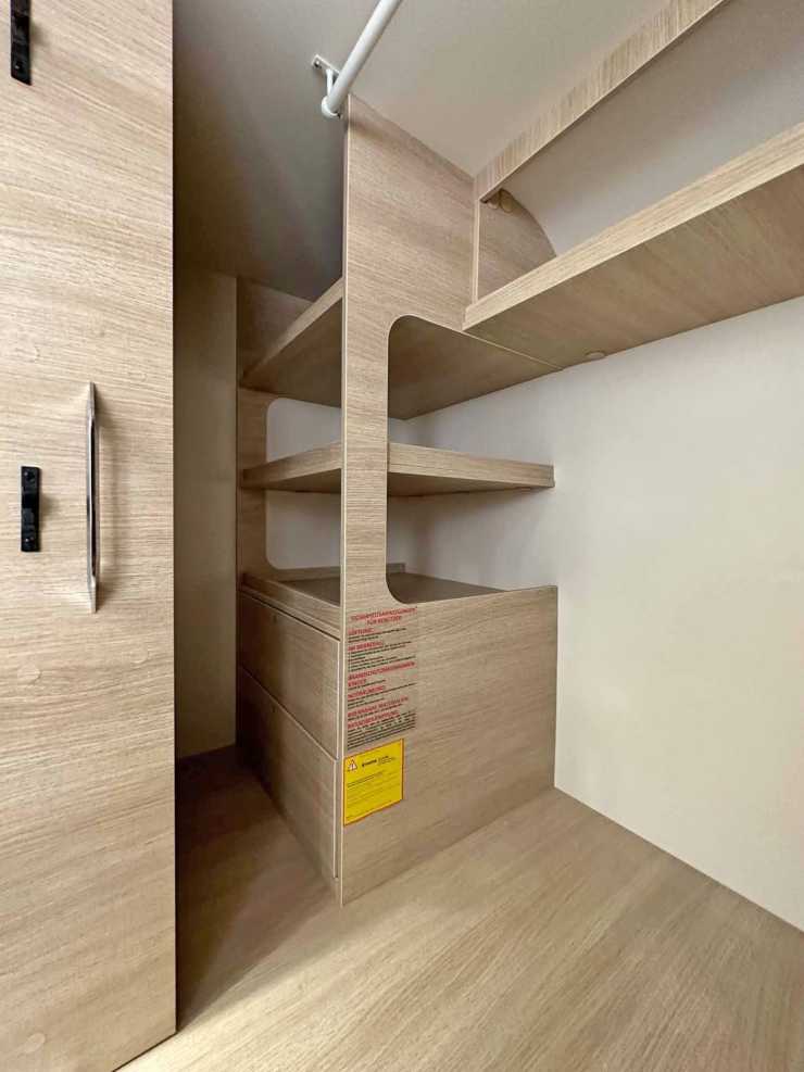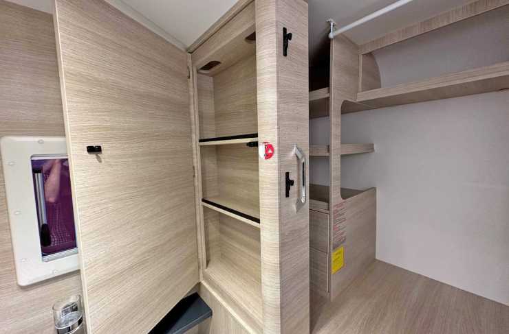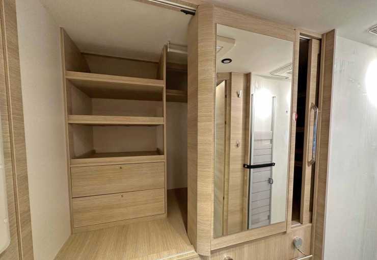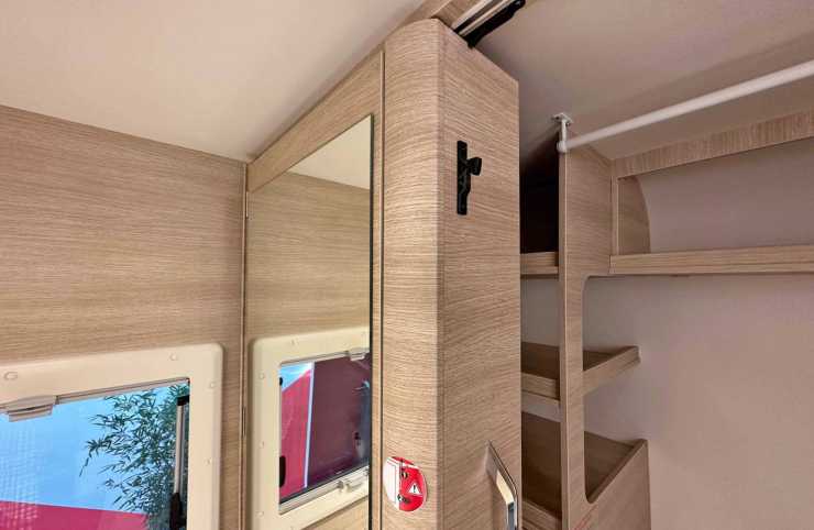 För i det här utrymmet finns också det som gör den här husbilen extra speciell: Förvaringen! Och till den hör spegelskåpet. Mer om det nedan.
