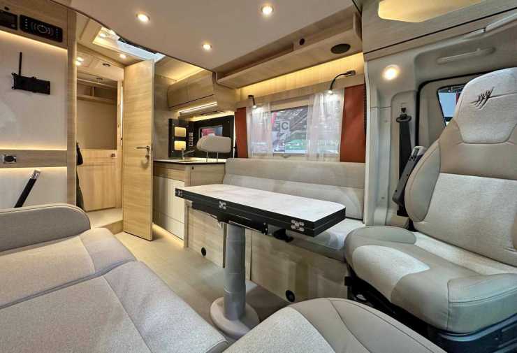 Här utnyttjas utrymmet när man kommer in i husbilen till face to face-soffor, som tillsammans med vikbordet och de snurrbara framsätena bildar en sittplats där 5–6 personer lätt får plats. Som gjort för umgänge med andra ord.