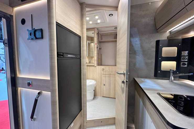Men titta in genom dörren så skymtar du höjdpunkten i Rapido 606F: Badrum och garderob. Häng med och ta en titt på det mysiga utrymmet.