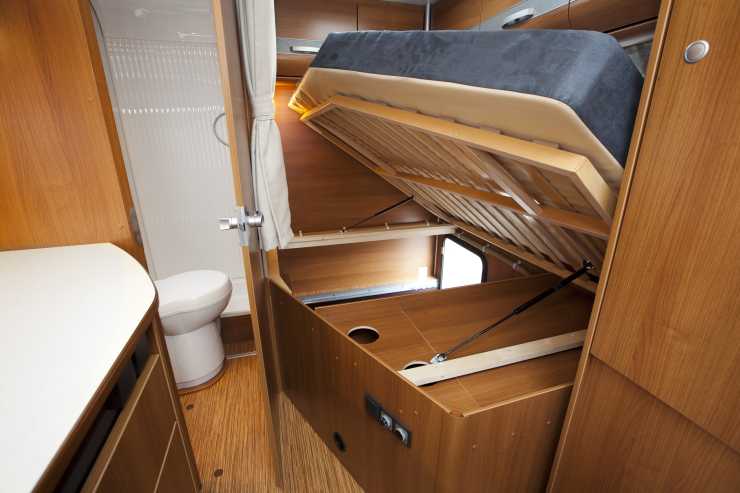 På vintern kan det däremot vara praktiskt att ha kassetten på den oftare snöröjda passagerarsidan. Längst bak på förarsidan sitter luckan till förvaringsutrymmet. Den främre delen av utrymmet tas i anspråk av pannan och träpaneler för att skydda denna. Men det finns gott om utrymme kvar. Långa och platta eller hopfällbara saker kan med fördel stuvas in i ett avlångt utrymme som löper från luckan in under hygienutrymmet. 60 centimeter brett, 28 centimeter högt och 218 centimeter djupt är det. Det gäller bara att inte skjuta in något längst in som är litet och tungt, då kan det bli svårt att få ut det. Resterande del av lastutrymmet är som mest 128 centimeter brett, 125 centimeter djupt och 62 cm högt.