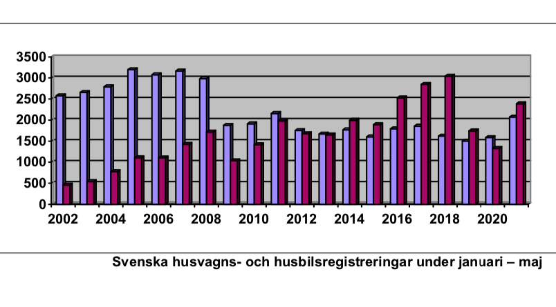 Trafikanalys redovisar att det hittills i år nyregistrerats 2 254 husbilar mot 1 549 under samma period, januari till maj 2020, vilket är en ökning med 46 procent. När det gäller husvagnar redovisar de att det hittills under 2021 sålts 2 295 stycken mot förra årets 1 752, en ökning med 31 procent.