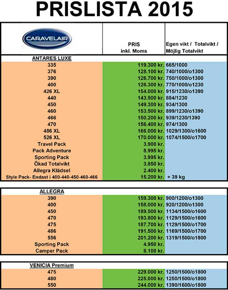 Den franska Caravelairfabriken har fyra olika modeller av husvagnarna med 22 olika interiörvarianter i sitt sortiment. För Antaresserien, som är fabrikens minsta modell, startar priserna på gynnsamma 119,300 kronor.