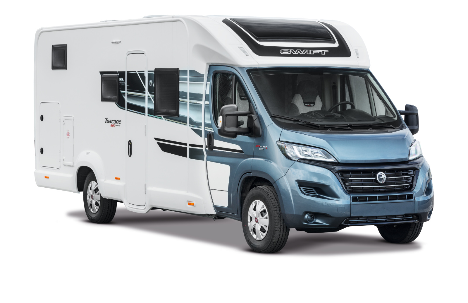 Swift fortsätter att satsa på den svenska marknaden och lanserar den helt nya Toscane 600-serien, bland annat modellen Toscane 694 med fem bältade sittplatser, sex stycken bäddar och en totalvikt på 3 500 kilo.