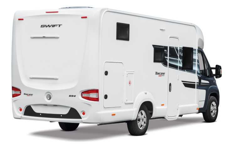 Nya Swift Toscane 694 EB och 694 QB är två av deras nya skräddarsydda modeller för den här kundgruppen. Toscane 694 är en 741 centimeter lång halvintegrerad husbil med nedfällbar säng över sittgruppen fram och sovrum bak med antingen långbäddar (EB) eller queensbed (QB). Unikt för modellen är att den har fem bältade sittplatser och att sittgruppen under fällbädden är bäddbar, vilket ger modellen totalt sex stycken bäddar.