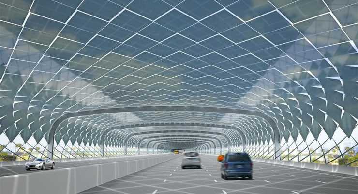 Så här skulle en "antibullertunnel" kunna se ut. Skissen kommer från ett tidigare projekt som föreslog en motorvägstunnel med solceller ovanpå i Los Angeles. Illustration: Måns Tham Arkitekt.