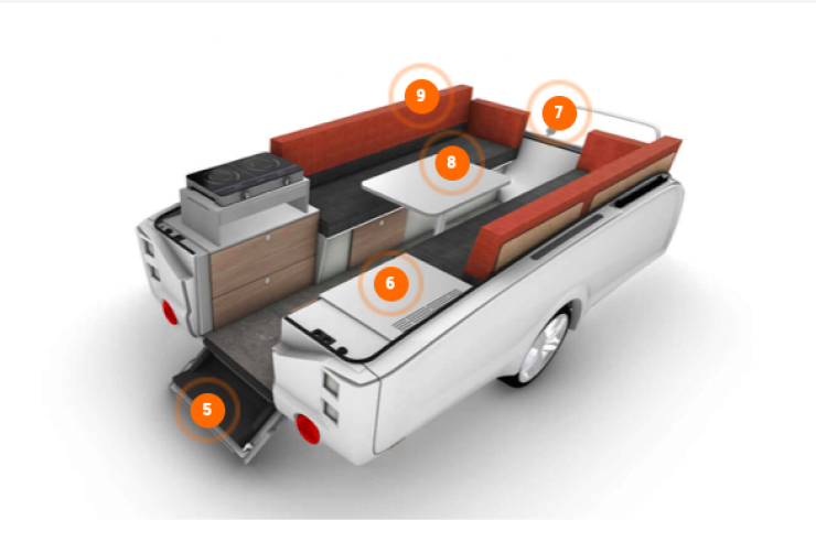Konstruktionen beskrivs av tillverkaren som en korsning mellan en husvagn med lyfttak och ett hopfällbart släp. Under den låga karossen består interiören av två skåp, två långa bänkar och ett bord medan spisen under körningen förvaras i en av de två kökslådorna.
