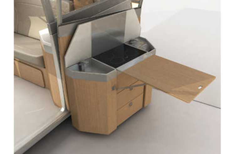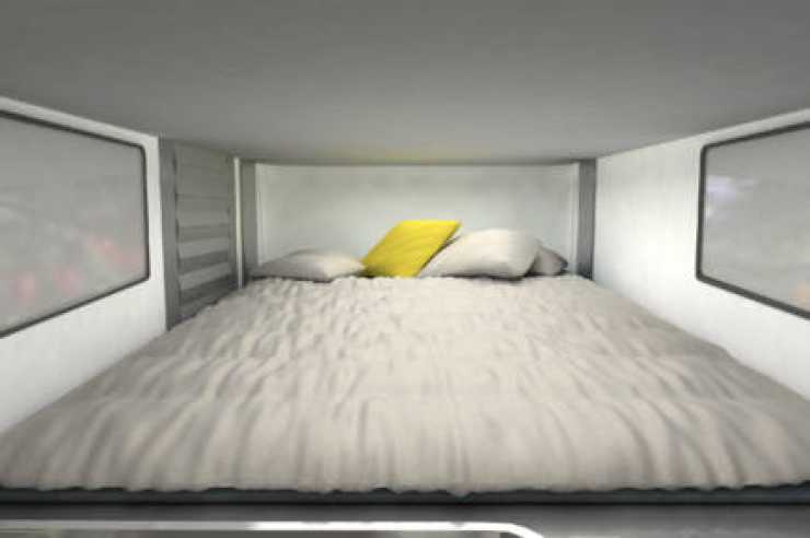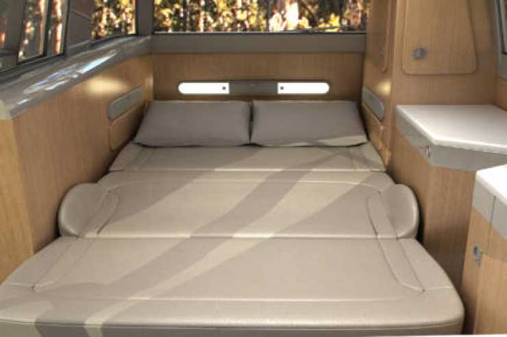 Passagerarens ryggstöd blir en trappa till dubbelbädden på övervåningen när det fälls fram. En efterlängtad lösning för alla som tycker stegar mest är i vägen.