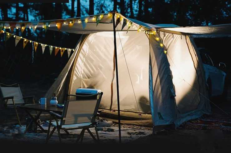 Tältet fästs med karborreband runt den öppna bakluckan – och sedan pumpas den uppblåsbara ramen upp med hjälp av en medföljande pump. Campingfordonet är med andra ord en Tesla med medföljande lufttält.