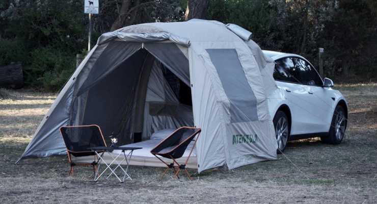 Tältet pumpas upp och fästs vid Teslans baklucka.
