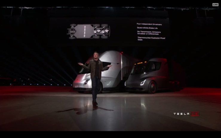 Tesla Semi har en rad intressanta lösningar. Trailern har dubbla drivaxlar med vardera två elmotorer. De fyra motorerna ger sammantaget ett vridmoment som väl matchar dagens dieseldrivna lastbilars men några exakta data angavs inte. Uppskattningar ger vid handen att effekten i hästkrafter passerar 1000. Detta då vardera av de fyra motorerna ger 258 hk baserat på att de redan används i personbilarna. Även driftsäkerheten framhölls då det inte behövs mer än två motorer för att klara drivningen. Drivkraften fördelas automatiskt mellan höger och vänster drivhjul för att trailern ska kunna bromsas in utan att ställa sig på tvären, något som är vanligt i kritiska situationer. Dessutom återvinns 98 procent av energin vid inbromsning, något som på presentationen gjordes med devisen bromsar med evighetsliv.