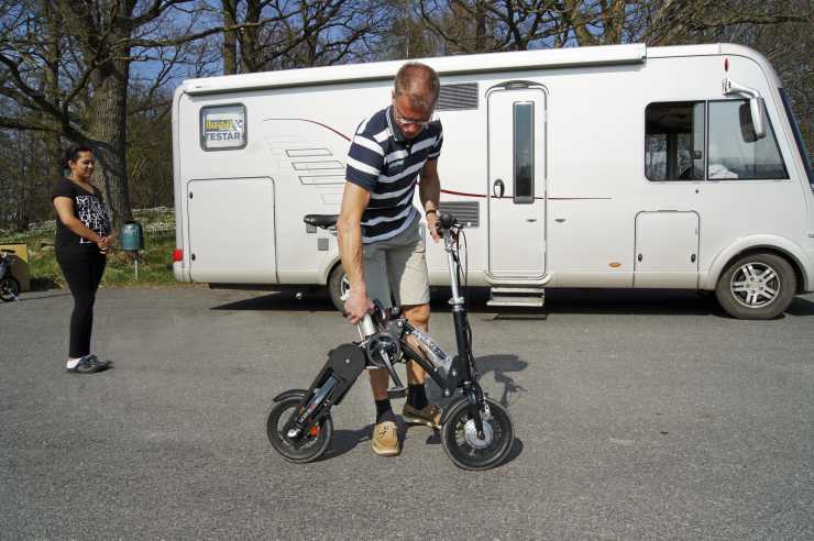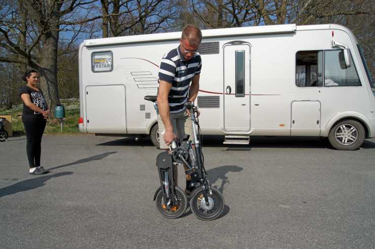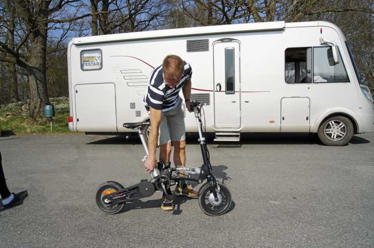 Cykeln är anmärkningsvärt enkel att fälla ihop, i bara några få steg förvandlas den till ett litet paket. Jag gör manövern några gånger och får snabbt in handlaget. Ett stöd finns så även i vikt läge kan cykeln stå själv. Ett handtag gör det lätt att lyfta in den i husbilens garage.