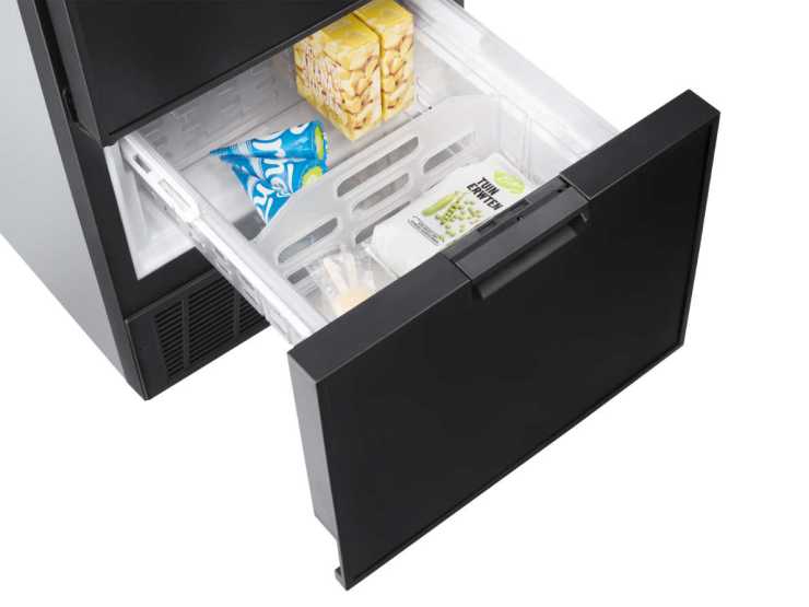 Thetford har placerat frysen nedertill och den har en egen dörr. Den är utformad som en låda vilket gör att kylan behålls mer effektivt samt att det är bekvämare att se vad som finns i frysen.