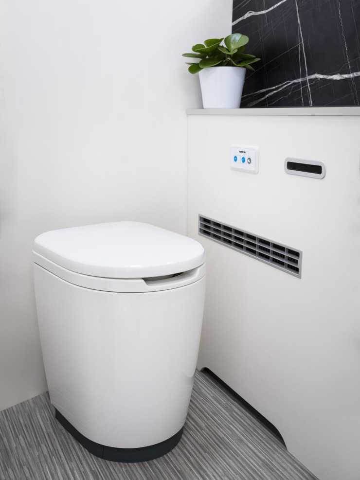 – Bara för att jämföra, hemma använder vi 3-10 liter per spolning. Och genom att återanvända gråvatten för spolning så sparas det cirka 112 liter färskvatten under en period av fyra veckor, och därmed också samma andel av avfallsvatten, skriver Van Noesel. Eftersom slangpaketet är kompakt och enkelt att installera, kan toaletten sättas fristående. Toaletten kan fixeras mot en vägg när du har en toalett med en konsol. Annars kan du placera toaletten varhelst du vill. Detta medför nya möjligheter av planlösningar för fordonstillverkaren. Då toaletten kan placeras fritt kommer man enkelt åt alla ytor och det är därmed enkelt att göra rent.