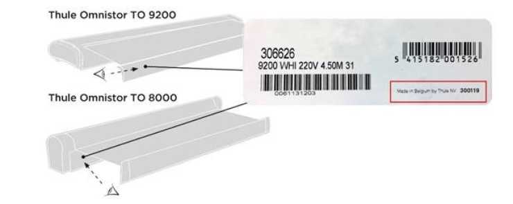 Om du har en Thule Omnistor-markis av modell TO 8000 eller TO 9200 med en rörmotor, ska du använda informationen på markisens tillverkningsetikett för att avgöra om din markis har tillverkats under perioden 1 juni 2016 till 31 juli 2019 (se bilder)