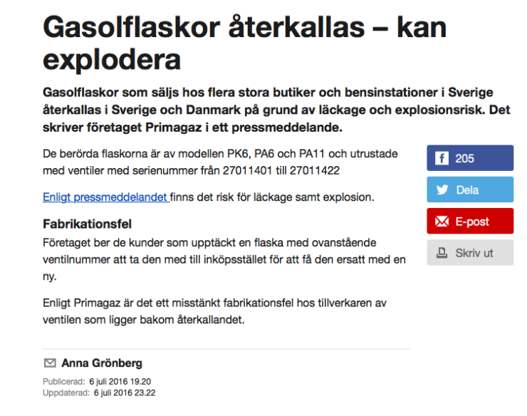 Här är nyheten från SVT 2016.07.06 tidsmarkerad 19:20 och uppdaterad 23:22: http://www.svt.se/nyheter/inrikes/gasolflaskor-aterkallas-kan-explodera
