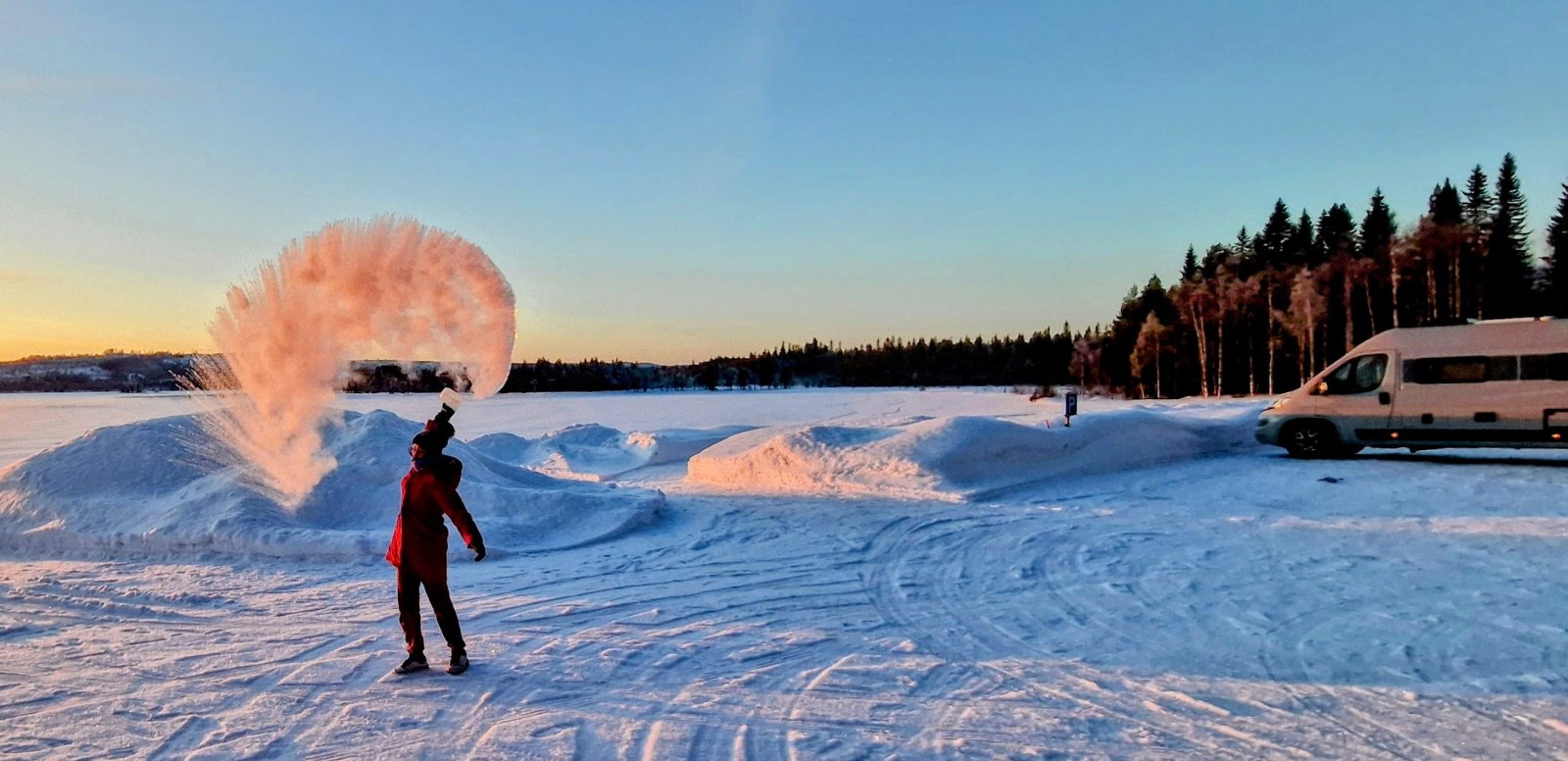 Vi lär oss att vatten fryser i minusgrader. Här praktiserar vi det genom att... kasta vatten. Mer om resans favoritcamping, där bilden togs, i ett senare avsnitt.