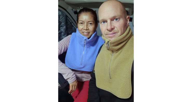 Fuskpolon får symbolisera lyckan på bild. Att klä sig i fuskpolo i varsin kulör är en ynnest vi gärna förunnar alla. Våra bästa plagg den här resan. Vår modell med dragkedja går en bra bit ned över bröst och rygg. Likt snuttefiltar bär vi dem ständigt och de räddar oss nog från både nackspärr och ryggskott!