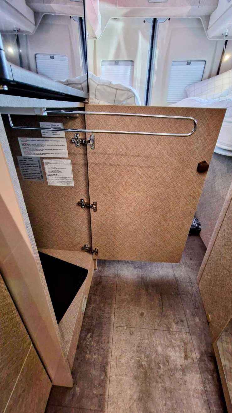 Det lilla facket under garderobens golv är iskallt och där huserar vattenpumpen, plus den blå avtappningskranen till vår 100 liters vattentank. Allt nås via en lucka. Här finns också ett varmluftsrör från Trumapannan som nonchalant passerar utrymmet och bara blåser ut varmluft mot mittgången.