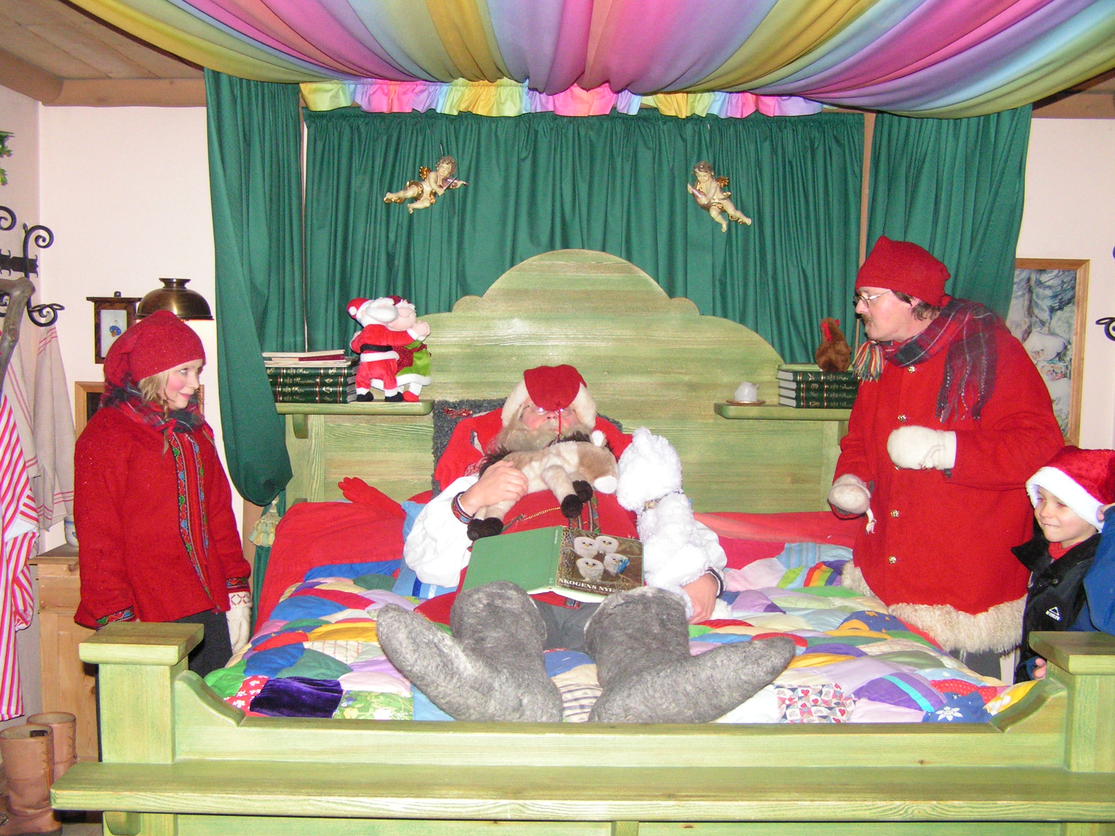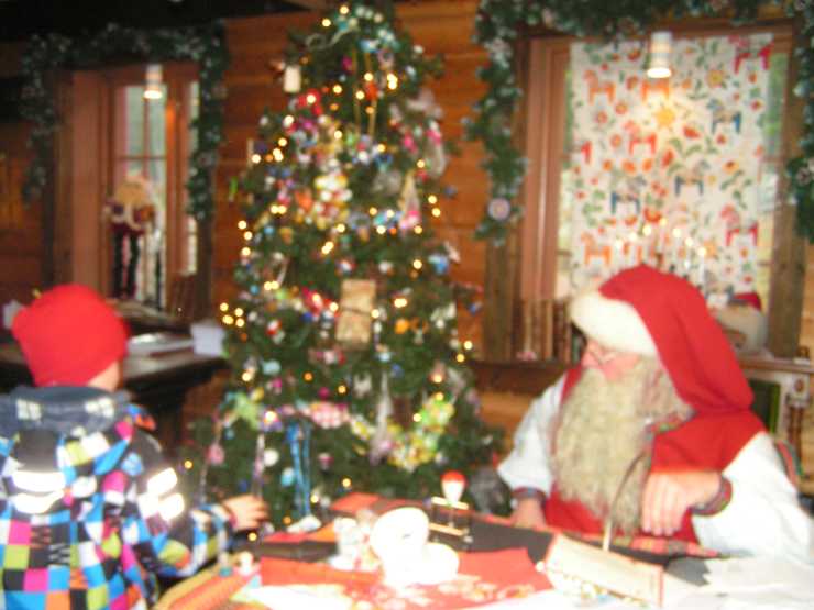 Efter att tomten hade vaknat berättade han att han renoverat köket efter bröllopet i fjol. Så nu har tomtemor rinnande kallt vatten, han berättade även om sin alldeles speciella gran med alla nappar som barn skickar från världens alla hörn, han visade oss till och med ett paket från Japan. Han har fått ca 6000 stycken nappar som han hängt upp i taket eftersom de inte får plats fler i granen.