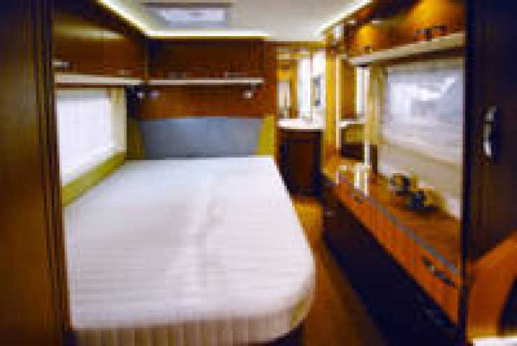 Frankia visade en större treaxlad husbil med mycket lyx och den stora dubbelsängen i bilens längdriktning.