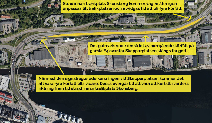 Närmast den signalreglerade korsningen vid Skepparplatsen kommer det att vara fyra körfält tills vidare. Dessa övergår att vara ett körfält i vardera riktningen fram till strax innan trafikplats Skönsberg där det åter igen anpassas till trafikplatsen och blir fyra körfält.